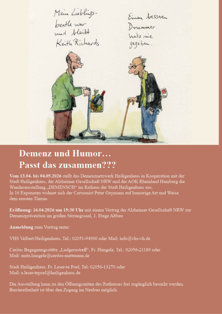 Das Demenznetzwerk Heiligenhaus zeigt bis zum 4. Mai 2026 in Kooperation mit der Stadt Heiligenhaus, der Alzheimer Gesellschaft NRW und der AOK Rheinland / Hamburg die Wanderausstellung „DEMENSCH“ im Rathaus der Stadt Heiligenhaus (Hauptstr. 157, 42579 Heiligenhaus). Die von Peter Gaymann als Cartoons gestalteten Ausstellungsexponate greifen das Thema „Demenz“ aus einer humorvollen Perspektive auf. ![]()